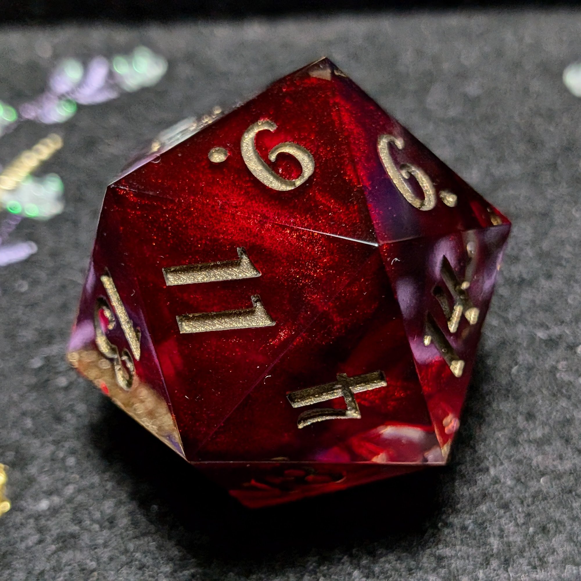 Blood and Gold - A clear resin base that is mostly hidden by shimmery blood red swirls throughout. At some angles you can see into the middle or a little through it. The numbers are inked in a dark metallic gold.