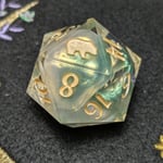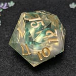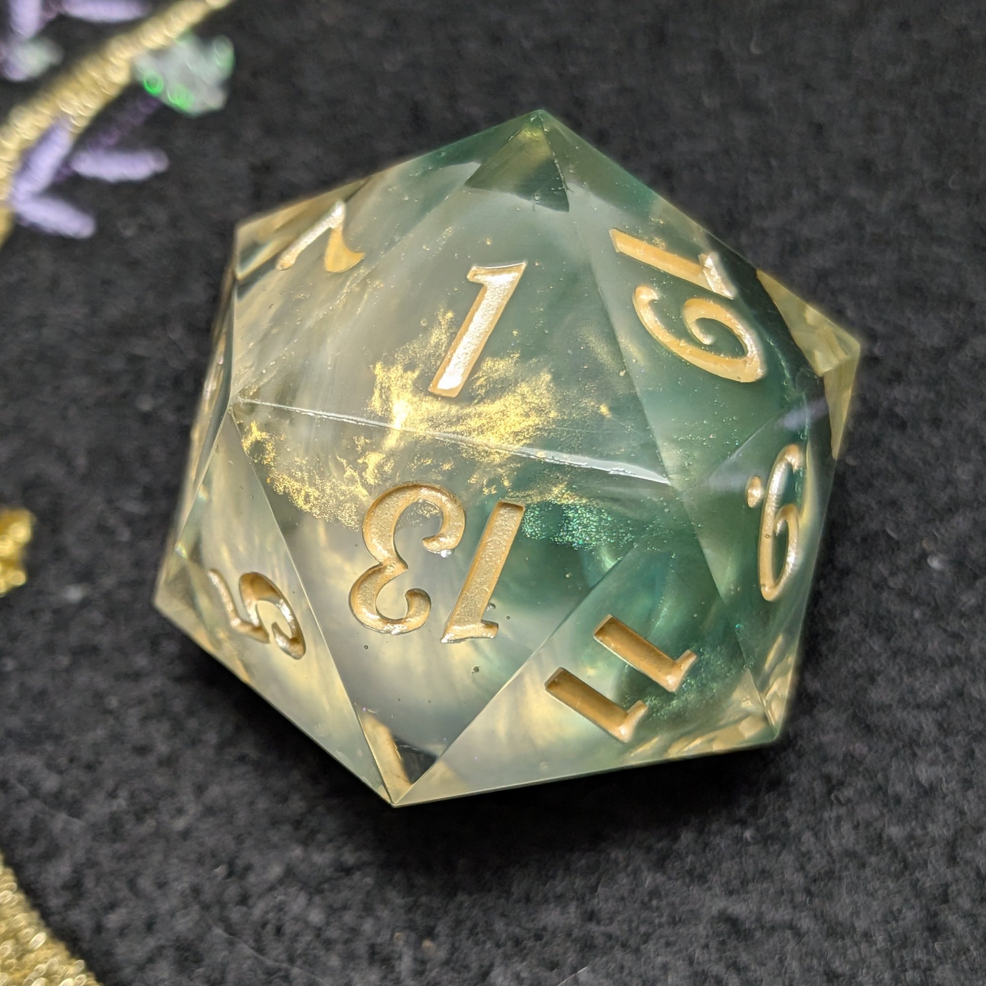 Green and Gold - A clear resin base with swirls/bloops of shimmery forest green and shimmery light gold. The numbers are inked in light gold.